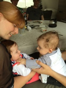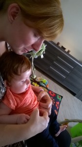 Vandaag ging je even op bezoek bij Cloe, zodat mama alleen naar de kinesist kon gaan.  Tante Stephanie was al eens twee uurtjes komen babysitten bij ons thuis, maar het was toch ergens de eerste keer dat je alleen bij iemand op bezoek ging (natuurlijk had mama je wel gebracht).  Cloe zei nog grappend dat mama het precies erg vond en jij niet om even van elkaar gescheiden te worden, maar toen mama weg was nam Cloe enkele foto’s die dit alleen maar bevestigden.