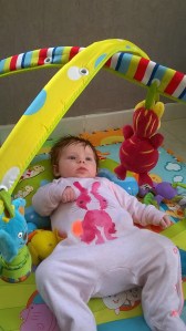 – Speelgoed boeit jou nog niet echt.  Wel kijk je heel graag rond en dit het liefst vanuit jouw sittertje.  Je kan uren gefascineerd naar jouw mobiel liggen kijken (vooral dan naar het leeuwtje).  Je hebt twee mobielen: ééntje boven jouw park en ééntje boven jouw bedje.  De mobiel aan jouw bedje kan je net aanraken met jouw teentjes als je jouw voetjes in de slaapzak hebt en jouw beentjes naar boven brengt.  Wat vind je dit leuk!  En mama en papa liggen dan soms glimlachend naar je te kijken vanuit hun bed, want inderdaad jouw bedje staat nog in de ‘grote’ slaapkamer.  Jouw leukste speelgoed is momenteel een tetradoek.  Met een tetradoek kan je jezelf wel even entertainen.